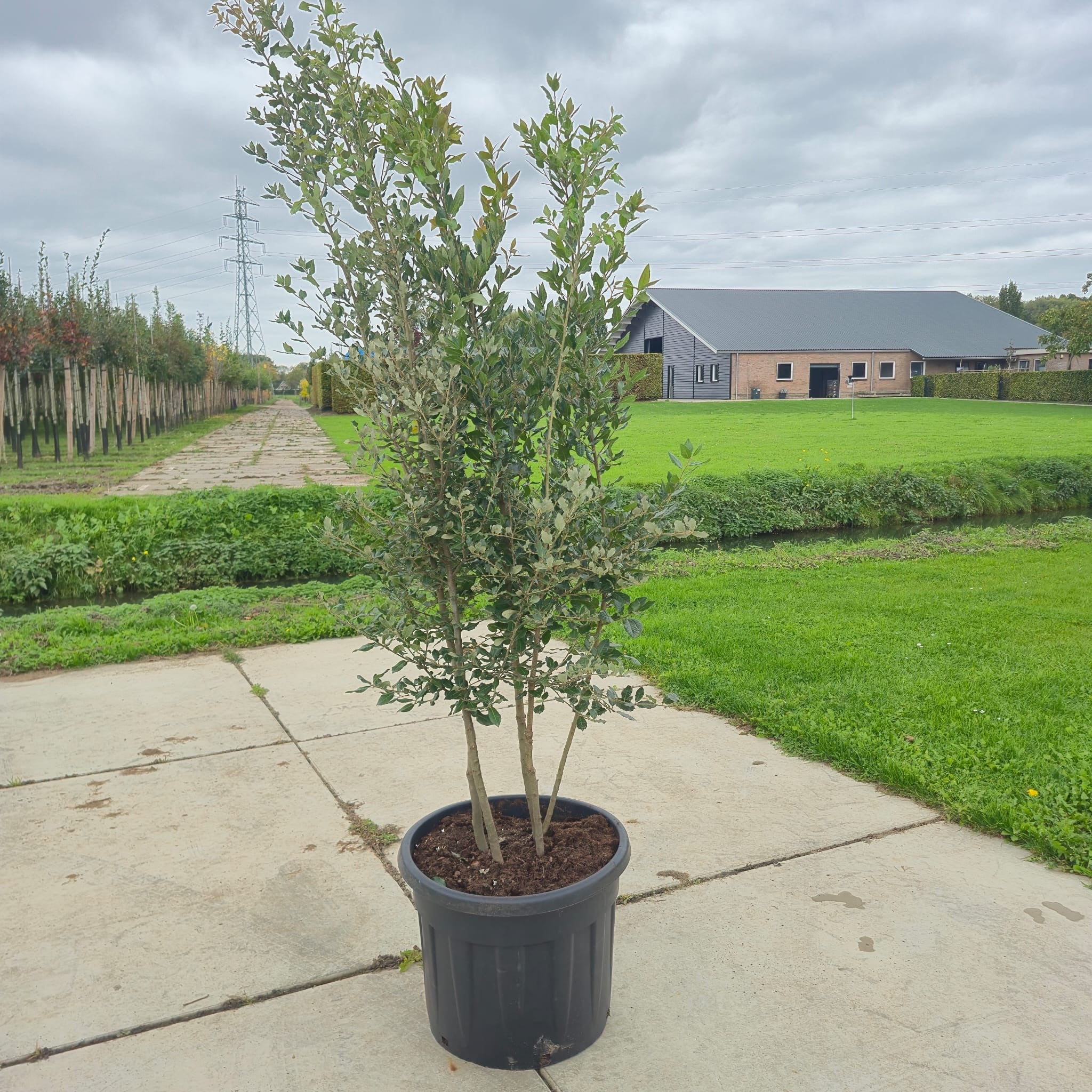 De Steeneik (Quercus ilex) is een groenblijvende eik die bekendstaat om zijn stevige structuur en dichte, leerachtige bladeren. In meerstammige uitvoering ontstaat een natuurlijke basis met meerdere opgaande stammen, waardoor de boom een volle, robuuste uitstraling krijgt. De glanzende donkergroene bladeren zorgen het hele jaar door voor kleur en privacy in de tuin.